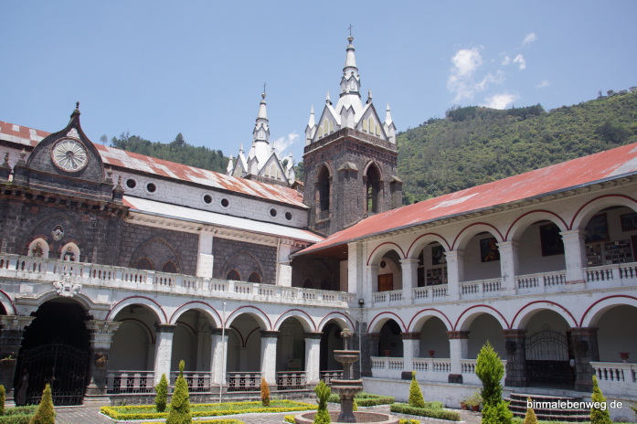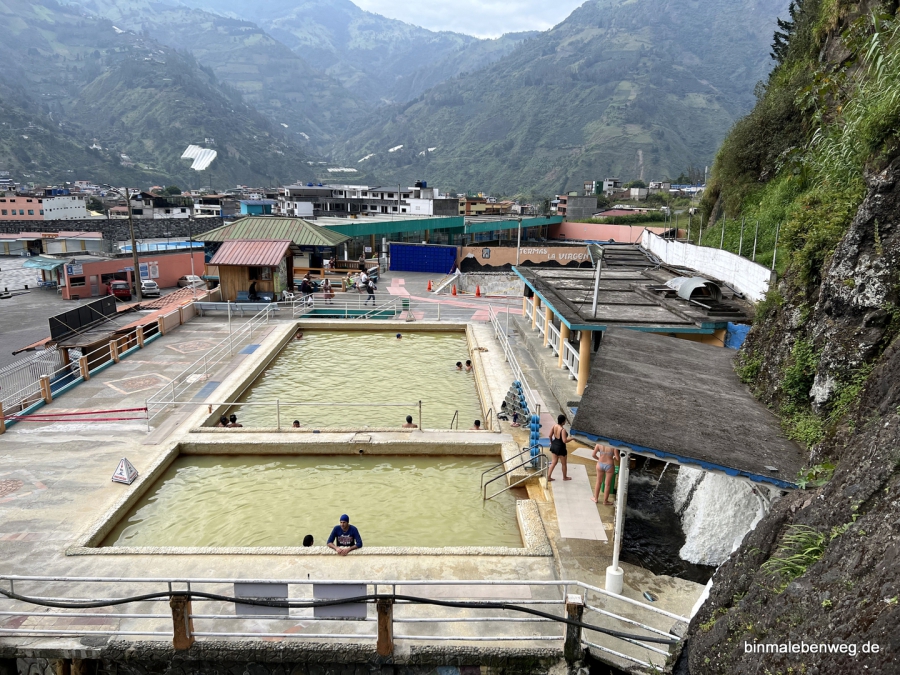 Baños ist bekannt für sein Thermalbad. Das ist mein nächstes Ziel. Alles ein bisschen umständlich das Einchecken usw., aber es funktioniert. Hier herrscht noch Badekappenpflicht. Also bin ich jetzt nicht nur stolzer Besitzer eines Panamahutes, sondern auch einer Badekappe, frisch für einen Dollar erworben.