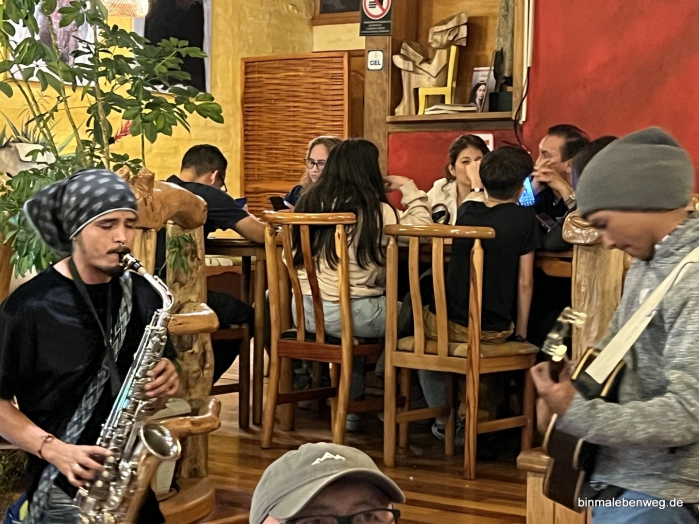 Während die beiden anderen noch mal in die Stadt zurückgehen auf der Suche nach einem schönen Café, gehen Claudia und ich ins Hotel zurück. Genau vor unserer Unterkunft liegt ein anderes Hotel mit Café, spontan gehen wir rein. Und die haben einen Innenhof mit drei Tischchen. Wow! Was für ein Ambiente! Aus dem Kaffee wird ein Meerschweinchen, hier bereits ohne Knochen auf verschiedenen Tortillas und mit leckeren Beilagen und Saucen serviert. Zu zweit nehmen wir uns so einen Teller. Schmeckt klasse!