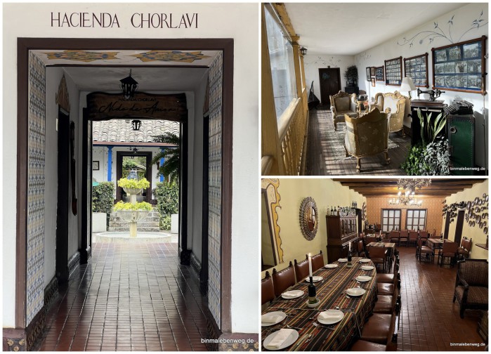 Auf dem Gelände der Hazienda Chorlavi bei Ibarra gibt es mehrere Nebengebäude – in einem davon sind unsere Zimmer – es gibt Swimmingpool und Sauna, aber auch Räume für Feiern, eine Kapelle und ein Hauptgebäude, das um einen Innenhof herum drapiert ist. In diesem wunderschönen Ambiente frühstücken wir.