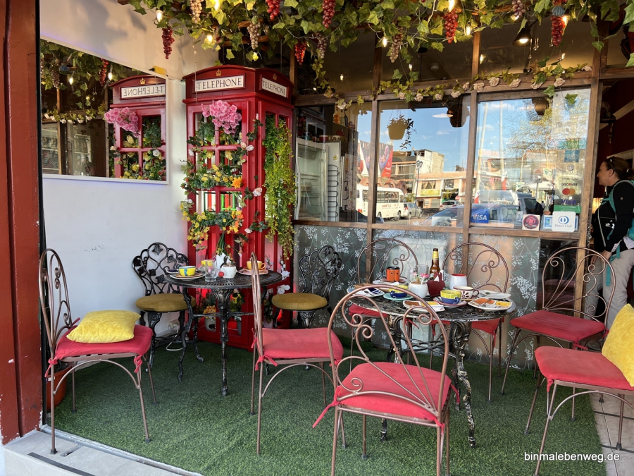 Auf dem Rückweg machen wir Halt in einem kleinen Dorf in einem Café direkt am Dorfplatz. Die Einheimischen, die an unserem Lokal vorbeilaufen, grüßen uns alle.