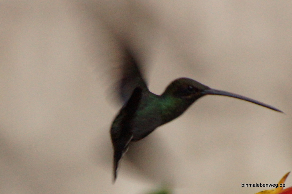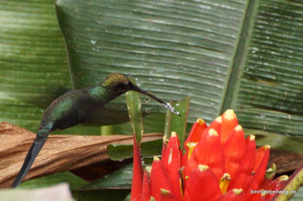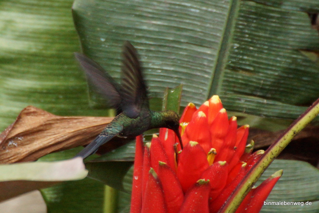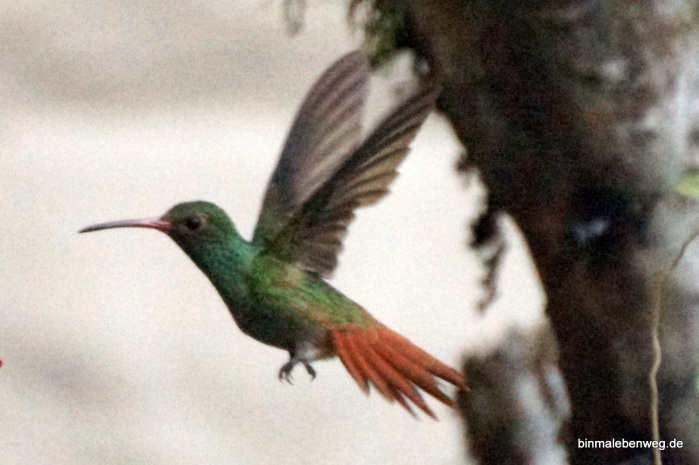 Heute gibt es Kolibris zum Frühstück. Nein, nein! Natürlich nicht zum Essen, die 1,6 bis 24 Gramm würden mich echt nicht satt machen. Aber beim Kaffee und Omlett sehe ich gerne den Kolibris zu, die es hier reichlich gibt, in allen Größen und Farben.