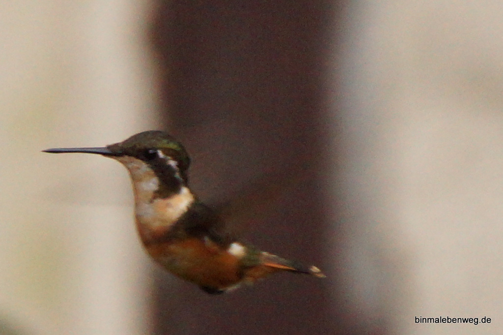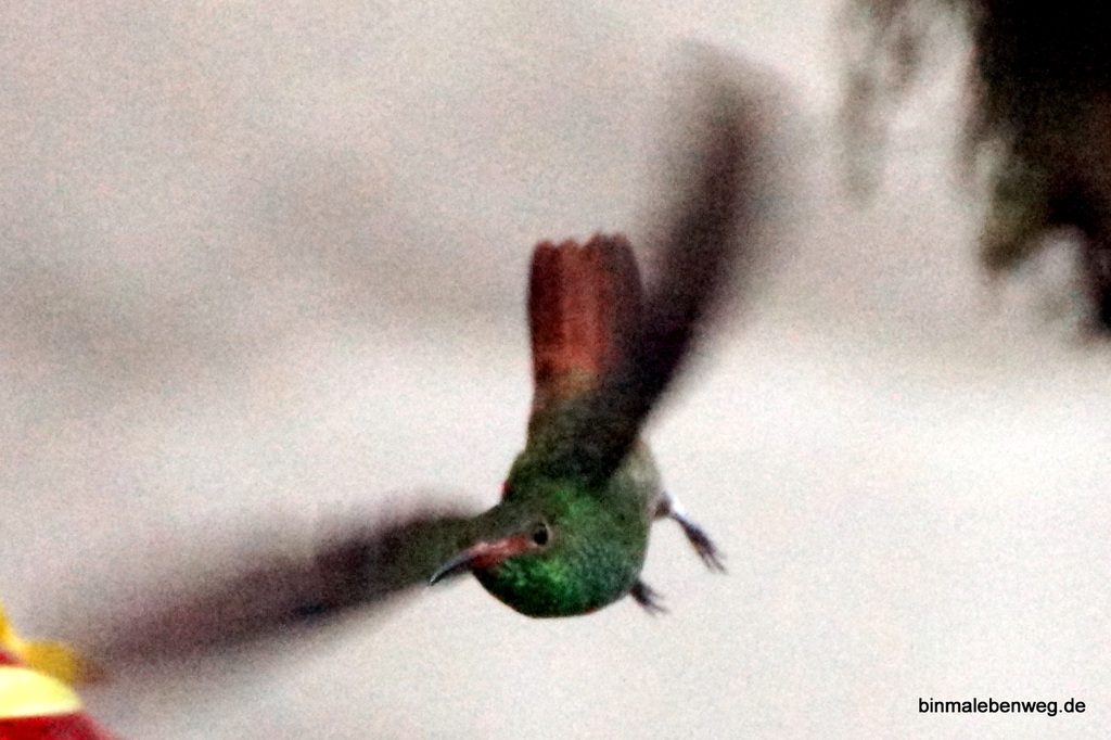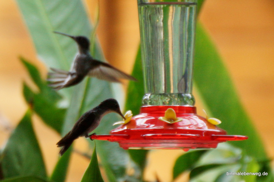O.k., es wird ein wenig getrickst, es gibt dort Leckerlies für Kolibris und andere Vögel. Die Kleinen mit einer Kamera einzufangen, bleibt aber trotzdem eine Herausforderung.