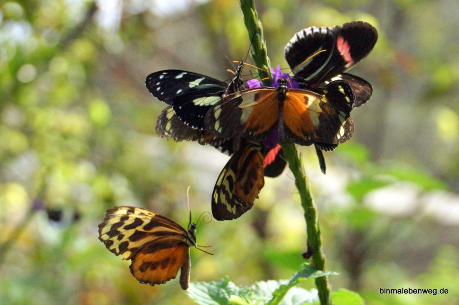 Wir sind in einer Schmetterlingsfarm. Dort werden sie großgezogen und flattern in zwei großen Hallen umher. In der einen Halle ist die Temperatur wie draußen, in der anderen ist es etwas wärmer und feuchter. Alles sehr bunt, sehr intensiv!