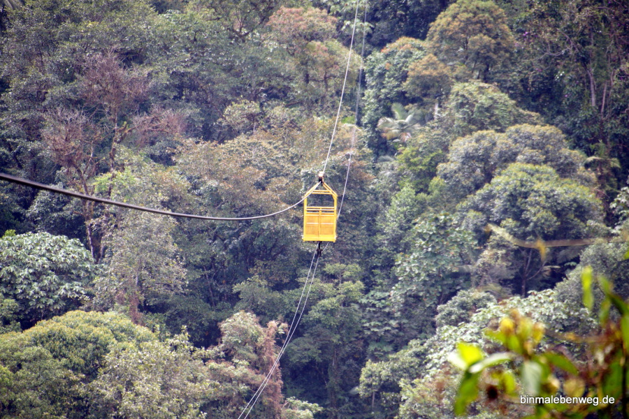 Sehr intensiv ist auch die Fahrt mit der Seilbahn, Marke Eigenbau. Ein gelber Kasten ein paar Stangen, die verhindern, dass die Passagiere rausfallen. Das Teil hängt an nur einem Seil und hängt locker 100 Meter über der Schlucht.