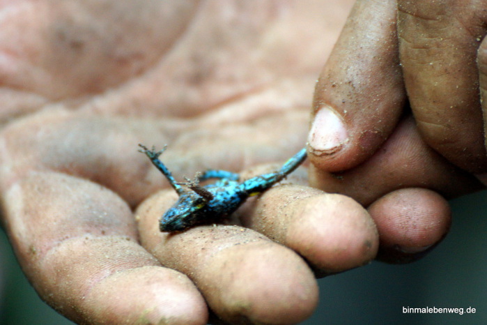 Primärregenwald erkennt man vor allem daran, dass kein Sonnenstrahl mehr bis zum Boden durchdringt. Wir erfahren viel über die Flora, weniger über die Fauna, weil wir kaum Tiere zu Gesicht bekommen, abgesehen von den süßen (hochgiftigen) Fröschen, ein paar Termiten, den hochgiftigen (mittelgroßen) Ameisen und den leckeren Zitronenameisen. Als der Guide fragt, wer die mal probieren will, melde ich mich. Ich lerne dabei, dass man die Ameisen lebend in den Mund stecken muss, sonst schmecken sie nach gar nichts.
