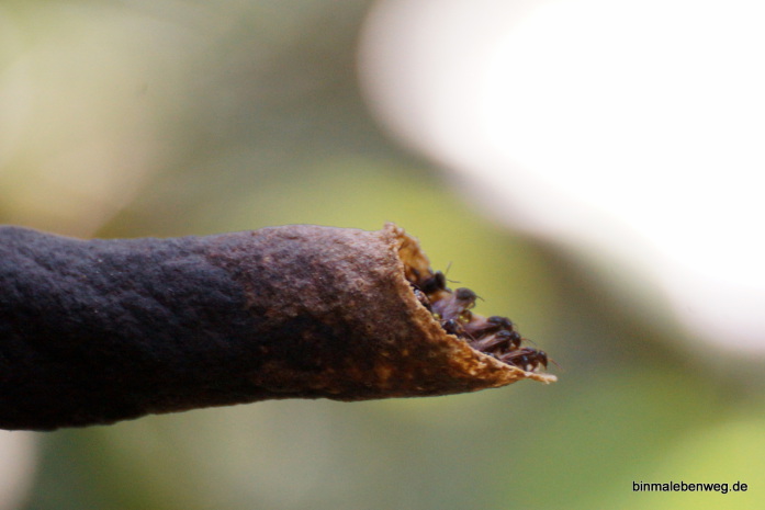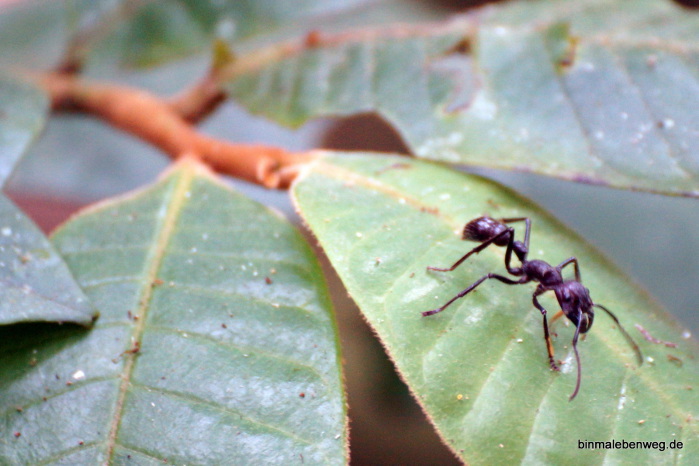 Fünf Sekunden bevor ich durch das Blasrohr puste, habe ich das Bild vor Augen, dass ich zu schwach blase und der Pfeil zwanzig Zentimeter vor meinen Füßen auf den Boden fällt. Es kam ganz anders: Volltreffer! Ich könnte mich im Urwald also verpflegen, vorausgesetzt, ich würde wenigstens ein einziges Tier zu Gesicht bekommen. Und für die Zitronenameisen brauche ich kein Blasrohr.