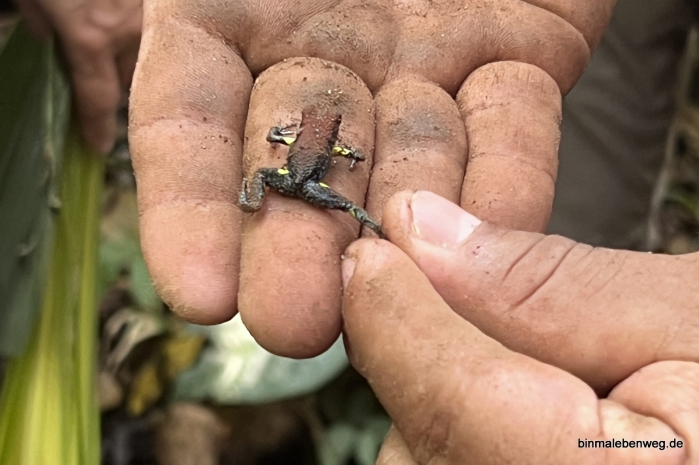 Aber wir wollen ja auch was vom Dschungel sehen. Also geht es mit unseren Gummistiefeln wieder an Land. Was wir zu sehen bekommen ist in erster Linie Sekundärregenwald. Als der Eigentümer unserer Lodge das Land erwarb, waren dort noch Plantagen, etwa Kakao. Der Urwald gewinnt das Areal immer mehr zurück, bis aus dem Sekundär- wieder Primärregenwald entsteht, wird es wohl an den meisten Stellen noch etwas dauern.