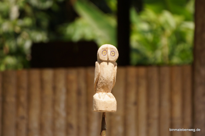 Nach einem leckeren Mittagessen geht es weiter mit dem Boot zu einer Familie, die Kakao anbaut. Bevor wir uns dort Kakao zubereiten (rösten, schmelzen und mit Obst mischen), probieren wir uns am Verschießen von Pfeilen mit Hilfe eines drei Meter langen Blasrohrs. Ich bin als letzter dran, bisher gab es zwar den einen oder anderen Treffer, aber ohne, dass der ein Pfeil in der Holzeule steckenbleibt.
