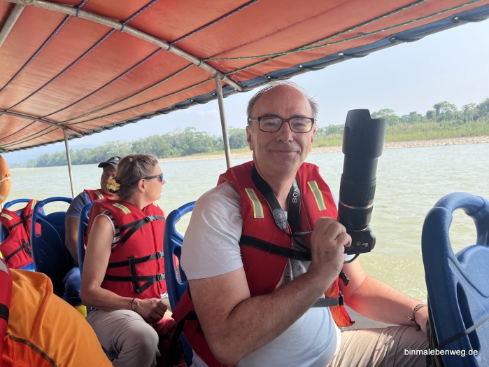 Der Kapitän unseres motorisierten Langbootes liest die Wellenbewegungen immer wieder ganz genau, schließlich kann sich der Lauf des Flusses ständig ändern, was gerade bei einem so geringen Wasserstand nicht ohne Konsequenz bleibt. So hält man es aus: Ich könnte stundenlang weiterfahren und mir den Wind um die Nase wehen lassen.