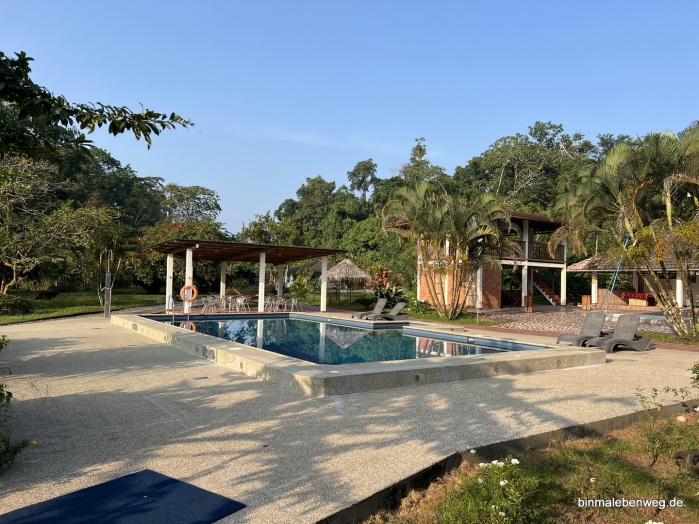 Keine fünf Minuten nach Ankunft in der Dschungellodge sitzen wir alle wieder im (warmen) Pool. Die meisten mit einer Flasche Bier in der Hand. Zu Essen gab es unter anderem einen leckeren Fisch, der in Blätter eingewickelt und ins offene Feuer gelegt wurde. Lecker!