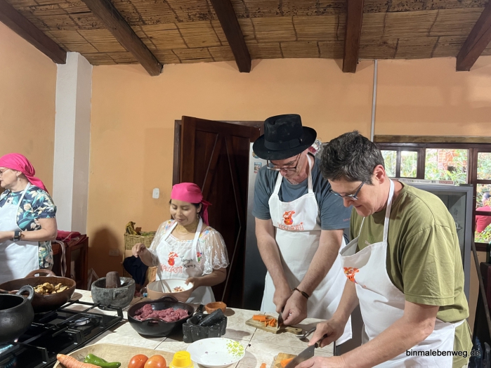 Zwei Stunden später werden wir im kleinen Dorf Kawsaymi noch mal so richtig gefordert. Weniger wegen der ganzen Feuer, die im Ort wüten, weil Altholz, Getreidereste, die Wiese o.ä. abgefackelt werden, sondern, weil wir ecuadorianische Spezialitäten selbst zubereiten. Ich mache z.B. Zwiebeln, Knoblauch, Karotten, Paprika und Peperoni klein.