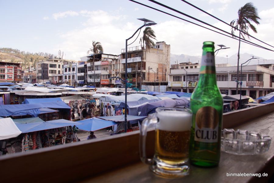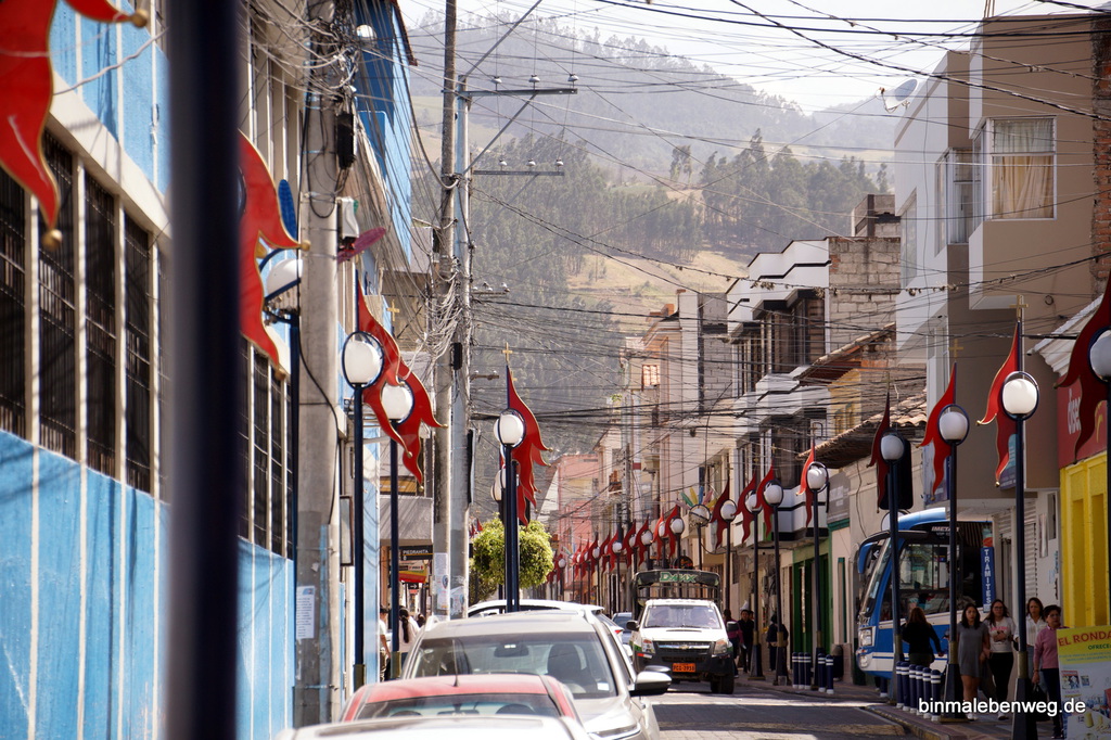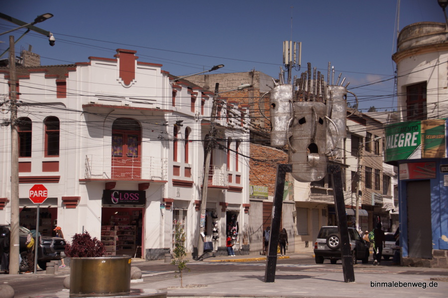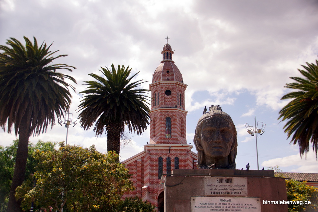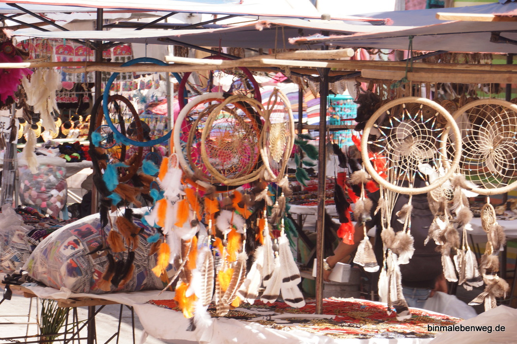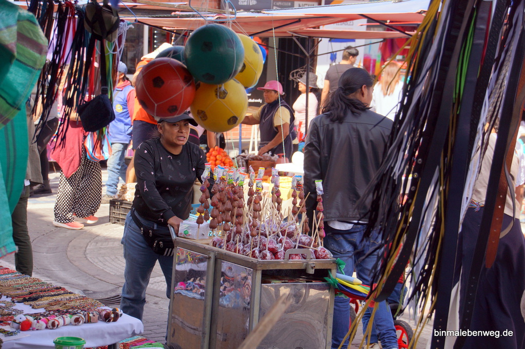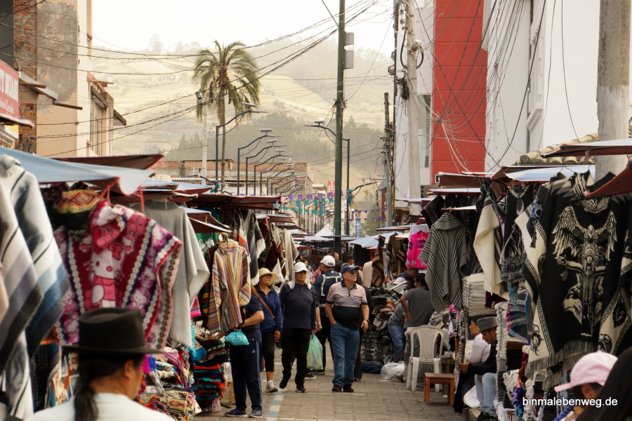 Unser nächstes Ziel, die Stadt Otavalo, ist für ihren riesigen Indigena-Markt bekannt. Ponchos und andere Wollwaren, Schmuck, Keramik, Hüte und vieles mehr wartet auf potenzielle Käufer. Als Mittagssnack gab es Kaffee und 1A-Kuchen, es ist also früher Nachmittag, als wir über den Markt schlendern. Die Atmosphäre ist entspannt, es sind keine aggressiven Verkäufer unterwegs. Ganz anders als etwa in Indien und Nepal oder gar in Ägypten und Marokko. Jeder, der mal in Marrakesch war, weiß, was ich meine.