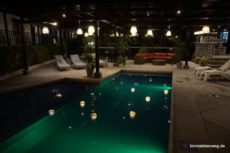 Als wir in unserem Hazienda aus dem Jahr 1620 ankommen, ist es längst dunkel. Es ist aber noch Zeit für ein Bierchen am Pool, bevor die Poolbar schließt.