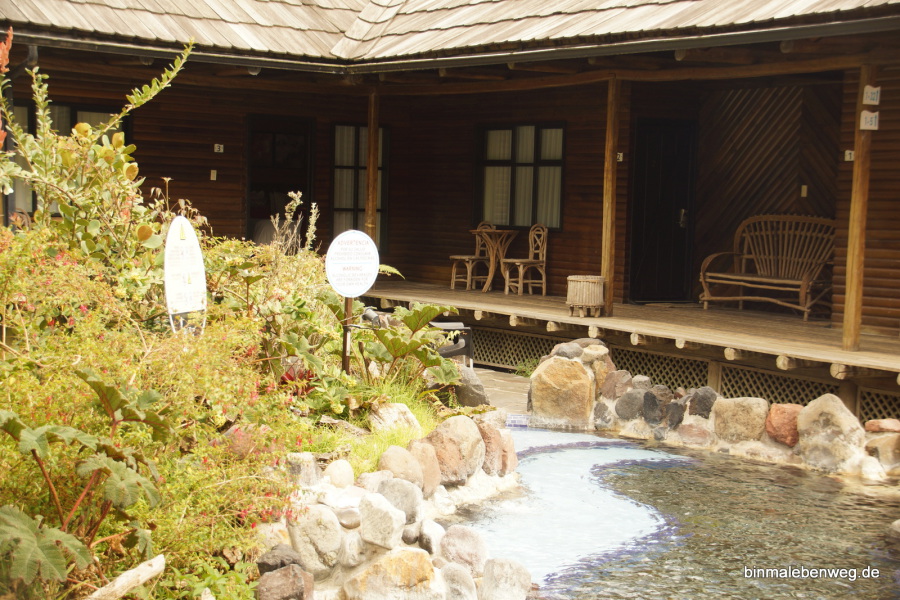 Jetzt wartet aber das Thermalbad des Hotels auf mich. Hier gibt es drei Temperaturstufen. Heiß – kochend heiß – Vulkaneruption.
