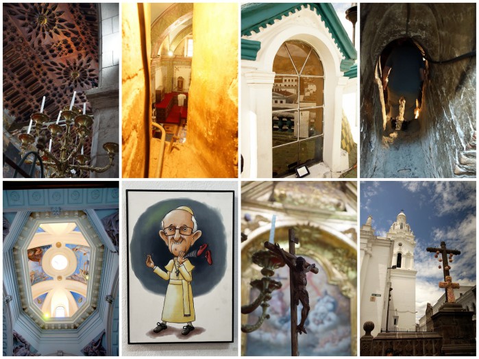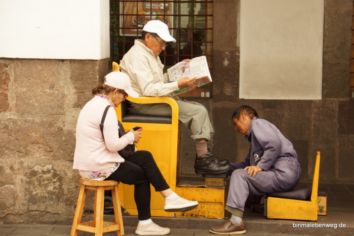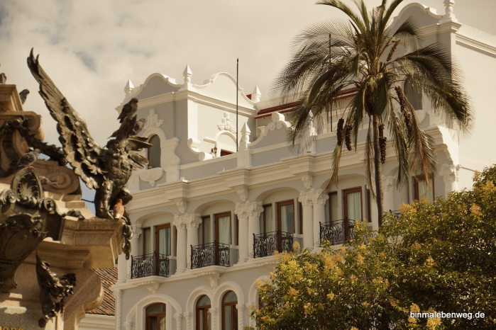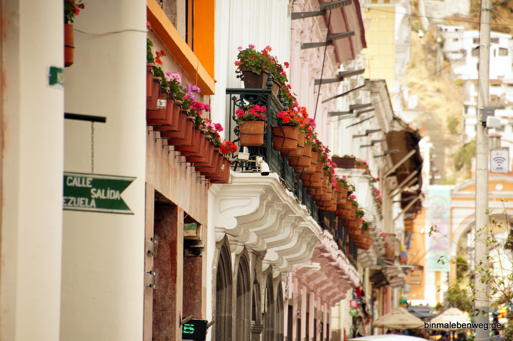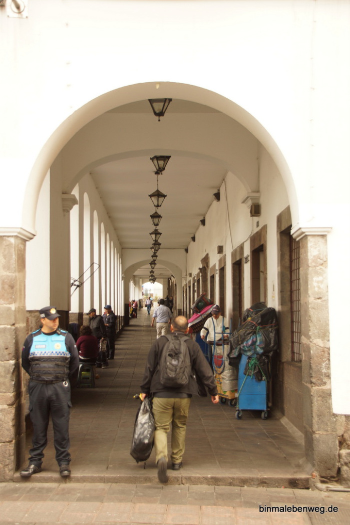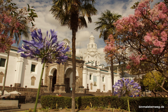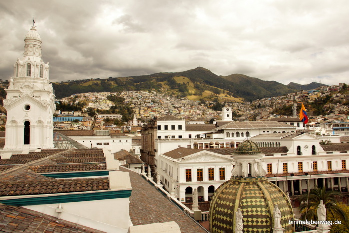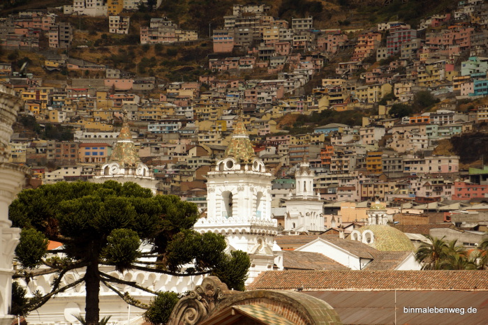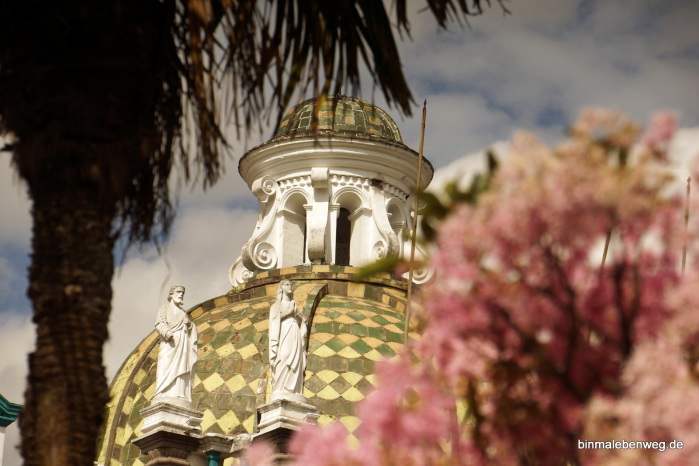 Quito – „Perle Südamerikas“, „Kloster Südamerikas“: Die 2.850 Meter hoch gelegene Hauptstadt begeistert mit ihrem Zentrum. Fantastische Kirchen, wunderschöne Plätze, alte Häuser. Tolle Stadt. Und ganz wichtig: wir kommen mit der Höhenlage inzwischen gut klar. So eine Stadtbesichtigung in der Höhe kann sonst schnell richtig schlauchen. Und Peterchen weiß inzwischen, dass er bei einem Foto aus der Hocke nicht schnell aufstehen darf.
