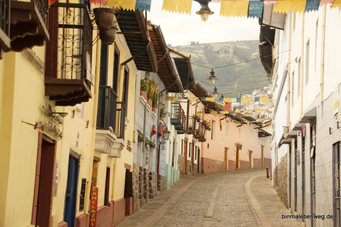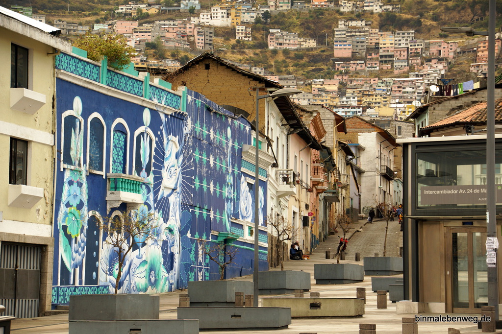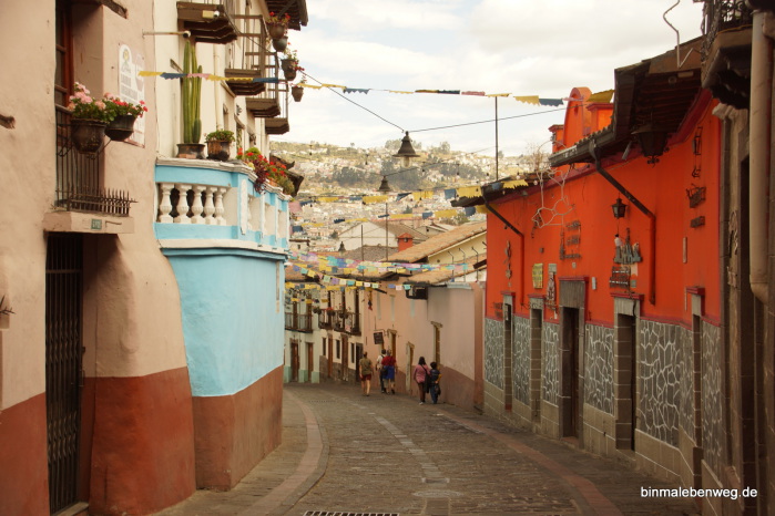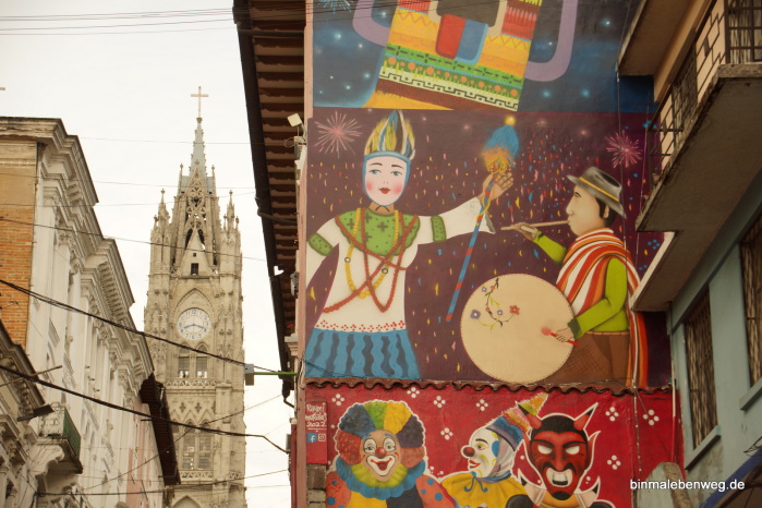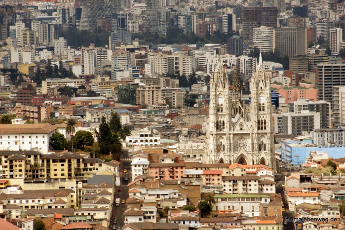 Am Ende der Gasse sind wir uns einig, dass wir noch zur Basilika del Voto Nacional wollen, die aufgrund ihrer exponierten Lage eigentlich von überall zu sehen ist. Das ist schon ein Stück da hoch, immer wieder bergauf und bergab, aber der Weg ist mindestens genauso spannend wie das Ziel.