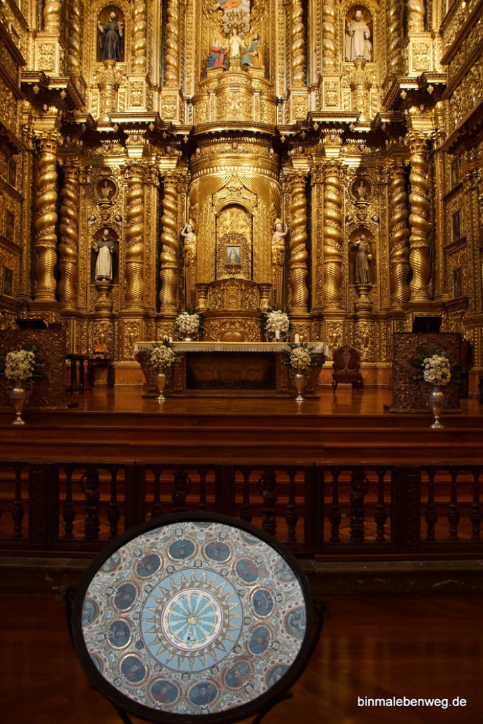 Aber da muss man ja nicht hinschauen. Schnell führt uns unser Weg in die Kathedrale. Dort sind einige Kunstwerke der Escuela Quitena zu sehen, herausragende Kunstwerke indigener Künstler, die bei uns wenig bekannt sind.