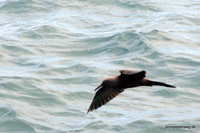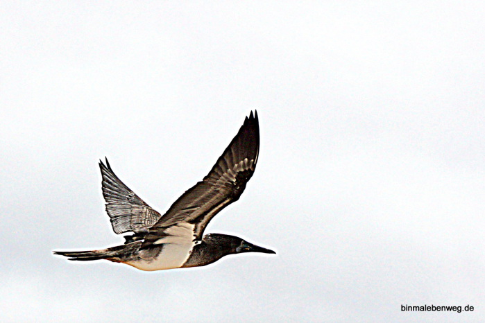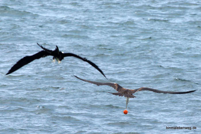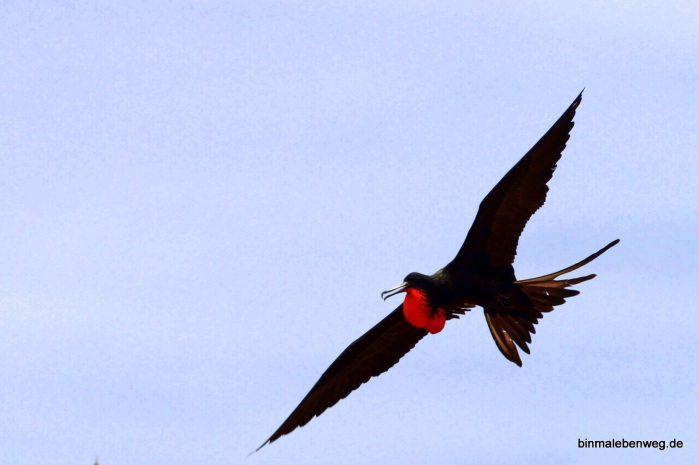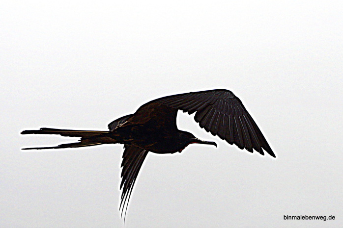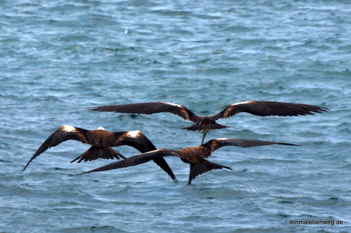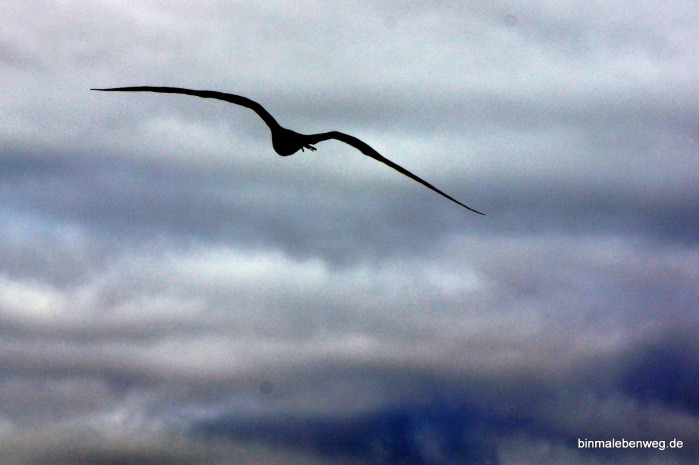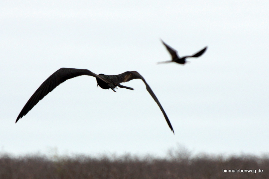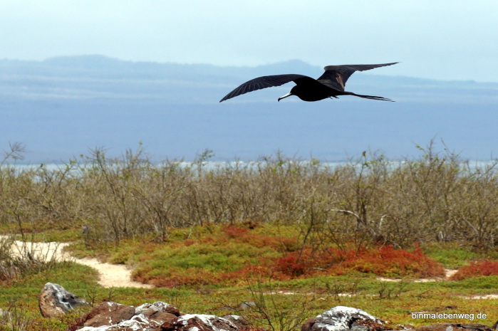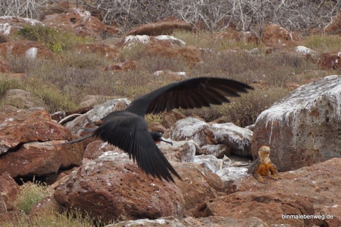 Auf Nord Seymour habe ich ein paar hundert Fotos gemacht. Da sind so viele Tiere unterwegs, so dass ich mir irgendwann den Luxus erlauben kann, wählerich zu werden. Etwa die Nachbarinsel mit ins Bild bekommen, die richtige Brandung abwarten, mehrere fliegende Vögel gleichzeitig ins Bild zu bekommen oder warten, bis über dem Leguan ein Vogel vorbeifliegt.