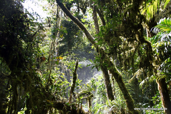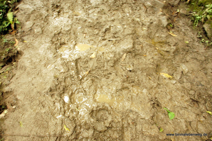 Kein Wunder, sind wir doch wieder oberhalb von 2.000 Metern unterwegs, außerdem geht es laufend rauf und runter. Vor allem aber – wir sind hier schließlich im tropischen Bergregenwald unterwegs – ist der Boden total schlammig und rutschig, an vielen Stellen sinkt man locker mal 10 bis 20 Zentimeter tief ein. Ach ja - fast hätte ich es vergessen – da viele Pferde mit Touristen unterwegs sind, liegen auch überall die Hinterlassenschaften der Tiere. Auf gut Deutsch: Überall liegt die Scheiße herum. Matsch und das andere Zeugs sind nicht wirklich auseinanderzuhalten.