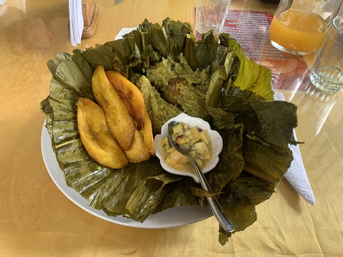 Das Essen schaut lecker aus! Unten und hinten mit großen Blättern ausgelegt, innen drin angemachter Reis, Huhn, ein Ei, Oliven und gebratene Bananen. Die sind leider auch das einzige, was mir wirklich gut schmeckt, der Rest war leider ziemlich fade. Ich war mir nicht sicher, ob das daran lag, dass ich stehend k.o. und ausgetrocknet ohne Pause gleich gegessen habe. Sabine sollte mir später bestätigen, dass das Gericht tatsächlich ziemlich ohne Geschmack war. Schade eigentlich, weil optisch hat das Essen wirklich 1A ausschaut!