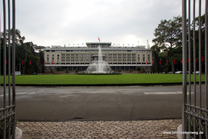 Vor dem Wiedervereinigungspalast machen wir ein Gruppenfoto; rein dürfen wir nicht, weil heute dort eine