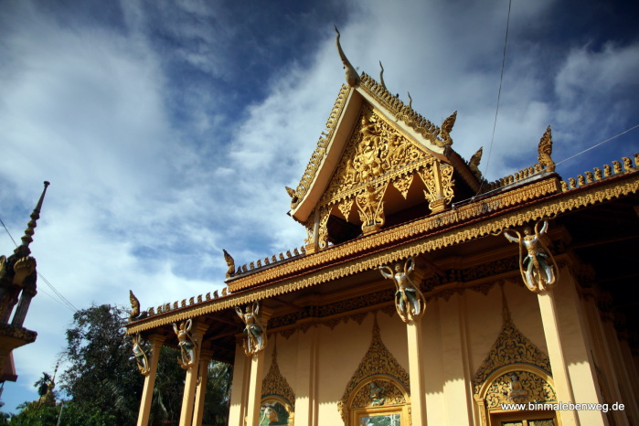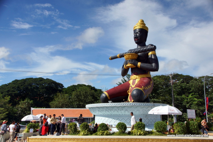 „Battambang“ bedeutet übersetzt „Der Stock des Königs“. Dazu habe ich neben dem, was uns Yim, unser Guide erzählt hat, verschiedene Interpretationen im Internet gefunden, die doch recht unterschiedlich sind. Nach einer dieser Legenden hat in Phnom Penh, also immerhin 300 Kilometer entfernt, ein schwarzer Mann auf die Kühe seiner Nachbarn aufgepasst, damit selbige nicht den Reis auf den Feldern wegfressen. Er ist aber eingeschlafen, konnte aber sehr weit hören und merkte nach dem Aufwachen, in welcher Richtung die Kühe waren. Er warf also seinen Stock in die Richtung der Kühe, erschreckte sie derart, dass diese darauf hin wieder zurückkamen. Der Stock landete in Battambang.
