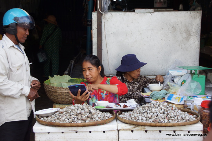 Über die Road 25 kommen wir – Überraschung! - zum Central Market von Battambang. So fasziniert ich von den Märkten Südamerikas, Afrikas und vor allem Asiens bin, langsam ist bei der Reise mein Bedarf an Märkten gedeckt! Trotzdem nimmt einen die ungewohnte Atmosphäre immer wieder gefangen.