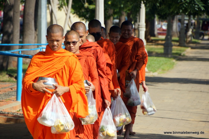Die Roben der Mönche sind inzwischen auch trocken, wir begegnen ihnen am Markt und am Fluss.