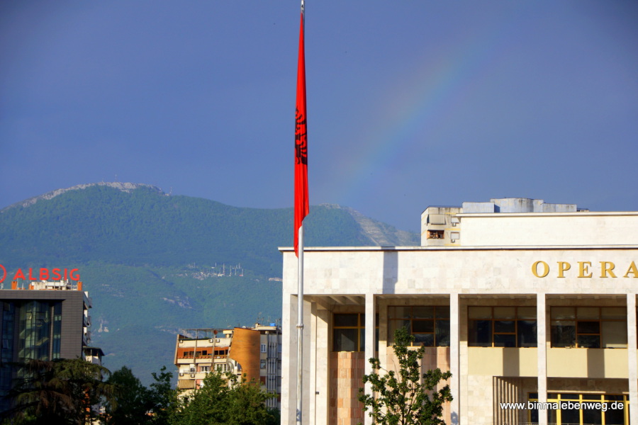 Im Mittelpunkt der Stadt liegt der riesige Skanderbeg-Platz mit Opernhaus, Kulturpalast und dem Historischen Nationalmuseum. Hinter dem Opernhaus sehen wir die schneebedeckten Berge und einen Regenbogen.