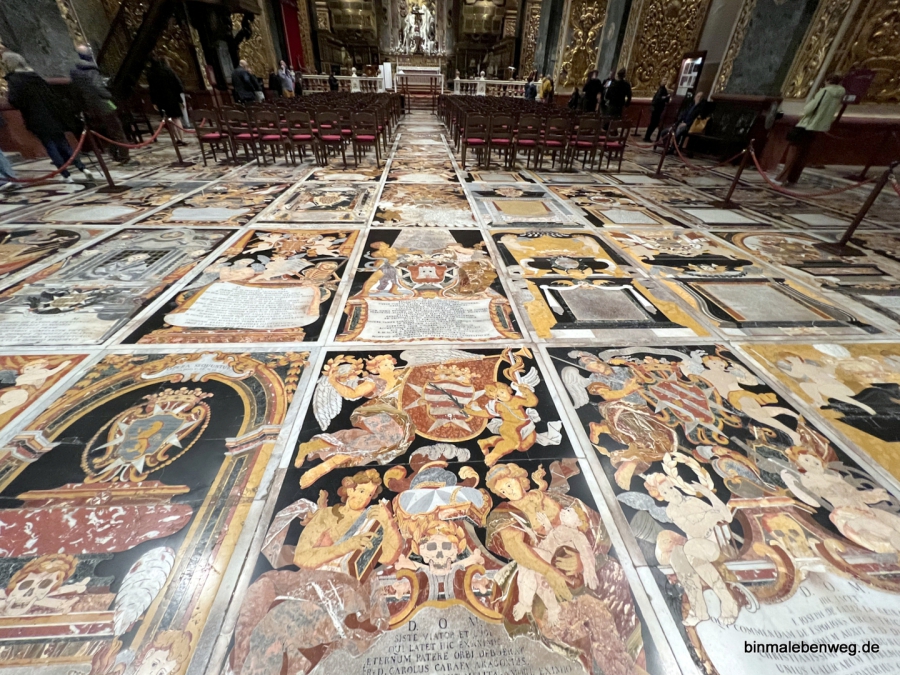 Auch so einen Boden habe ich noch nicht gesehen: Der Boden wird bedeckt von knapp 400 kunstvollen und meist auch sehr bunten Marmor-Grabplatten. Dazu kommen unzählige Gemälde an den Wänden, etwa „Der heilige Hieronymus beim Schreiben“ oder „Die Enthauptung von Johannes des Täufers“ von Carvaggio.