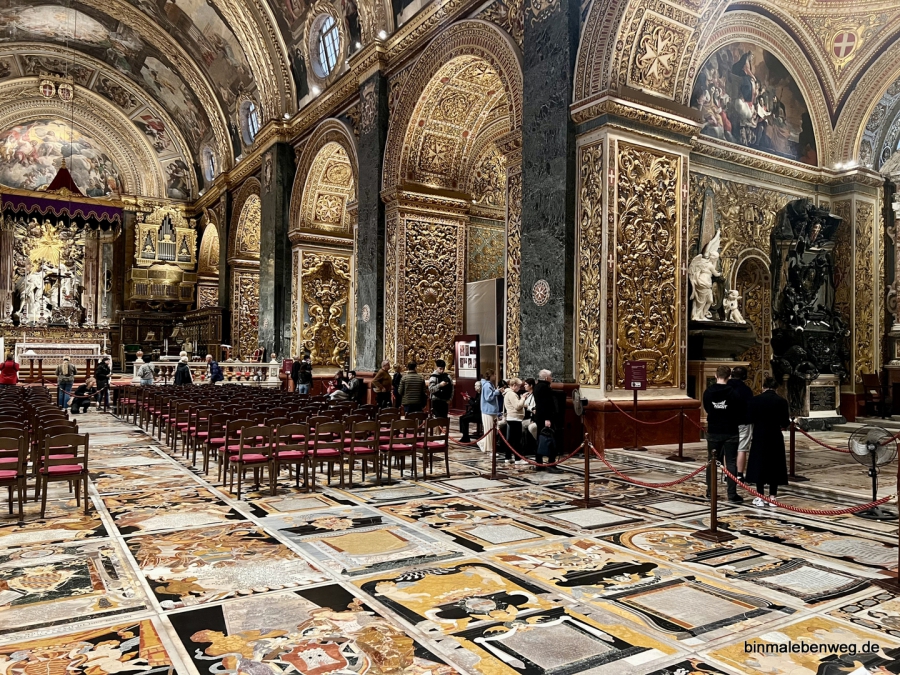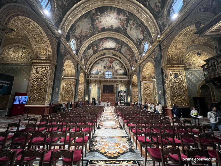 Die Kirche hat eine unglaubliche Liebe zum Detail, aber auch zum Prunk. Schließlich will jede der „Zungen“ des Malteserordens die anderen Zungen, also Landsmannschaften, übertrumpfen. Die Kapellen der Zungen sind ein Highlight. Die Gelder, die als Dank für den Sieg gegen die Osmanen flossen, ließen eine der opulentesten Gotteshäuser der Welt entstehen.